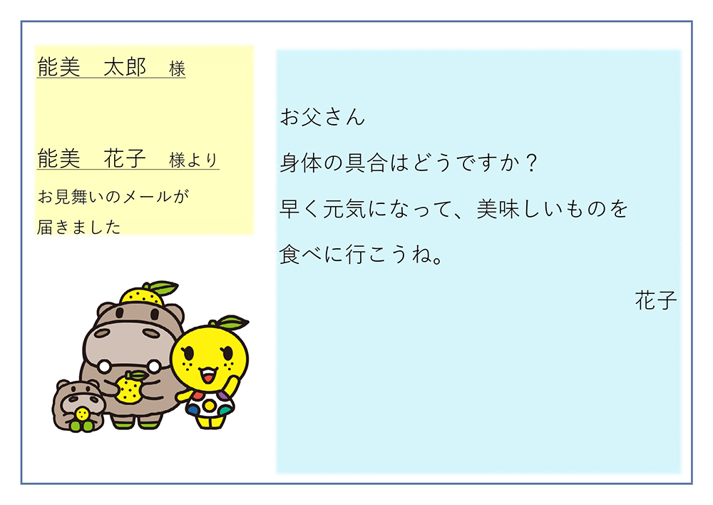入院中の患者さんに手紙を送りたい方は次のことを明記の上、以下の「お見舞いメール」からお送りください。