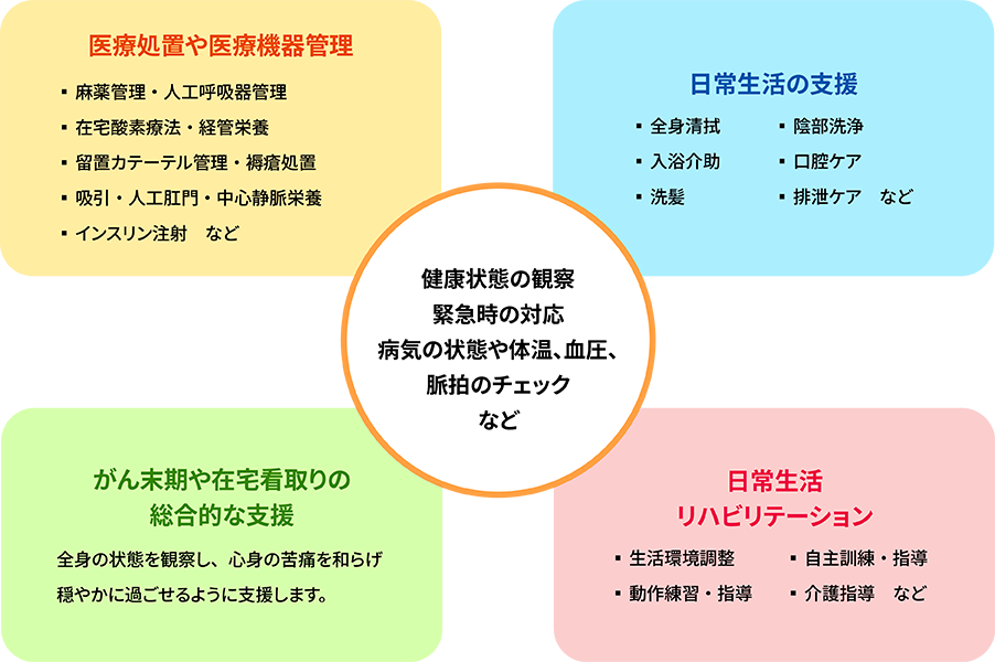 看護師がお住まいにお伺いし、かかりつけ医師の指示や連携により看護を行うサービスです。ご利用者や家族の意向、ライフスタイルを尊重し、QOL(生活の質)が向上できるよう多職種と協働しながら療養生活を支援いたします。